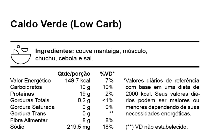 Versão leve do tradicional caldo verde, preparado com músculo, couve e chuchu. Fonte de proteínas e baixo em carboidratos.