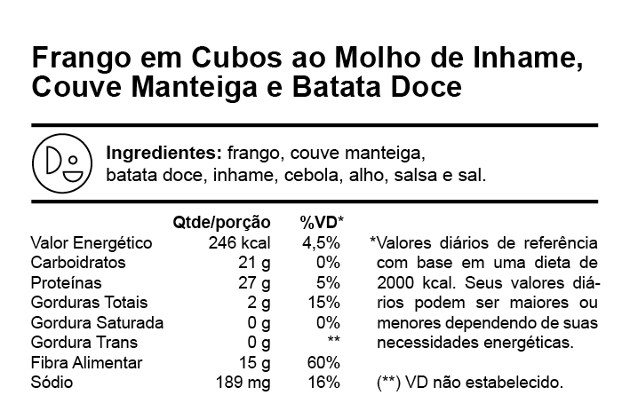Cubos de frango no molho cremoso de inhame, com couve refogada e batata doce. Receita pensada para energia e equilíbrio ao longo do dia.