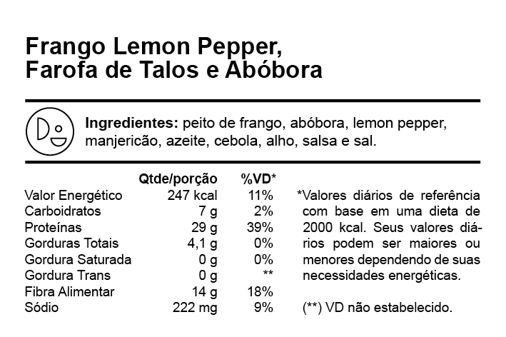 Filé de frango temperado com lemon pepper, servido com abóbora e farofa de talos. Um prato aromático e colorido, rico em nutrientes e sabor.
