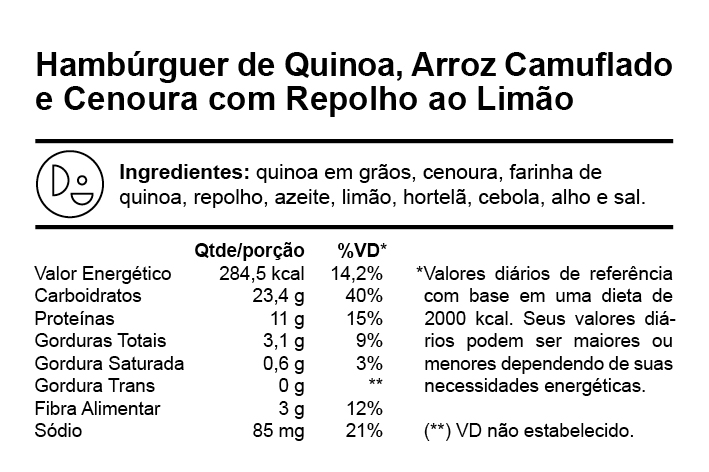 Hambúrguer de quinoa com cenoura e repolho ao limão, servido com arroz camuflado. Fonte de proteínas vegetais, vitaminas e minerais, ideal para uma refeição equilibrada e nutritiva.